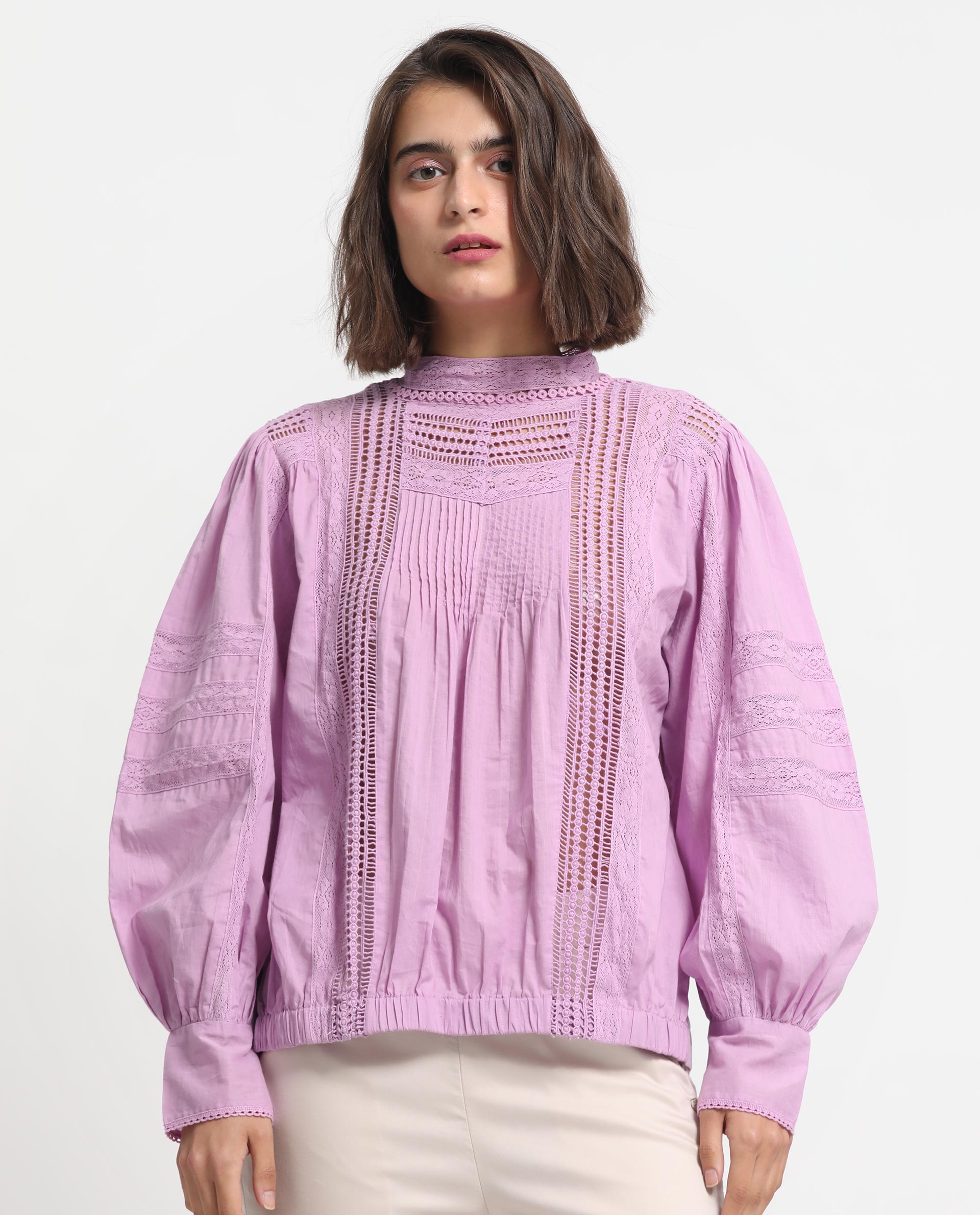 Rareism Women Schwan Light Purple Cotton Fabric Regular Fit High Neck Full Sleeves Solid Top