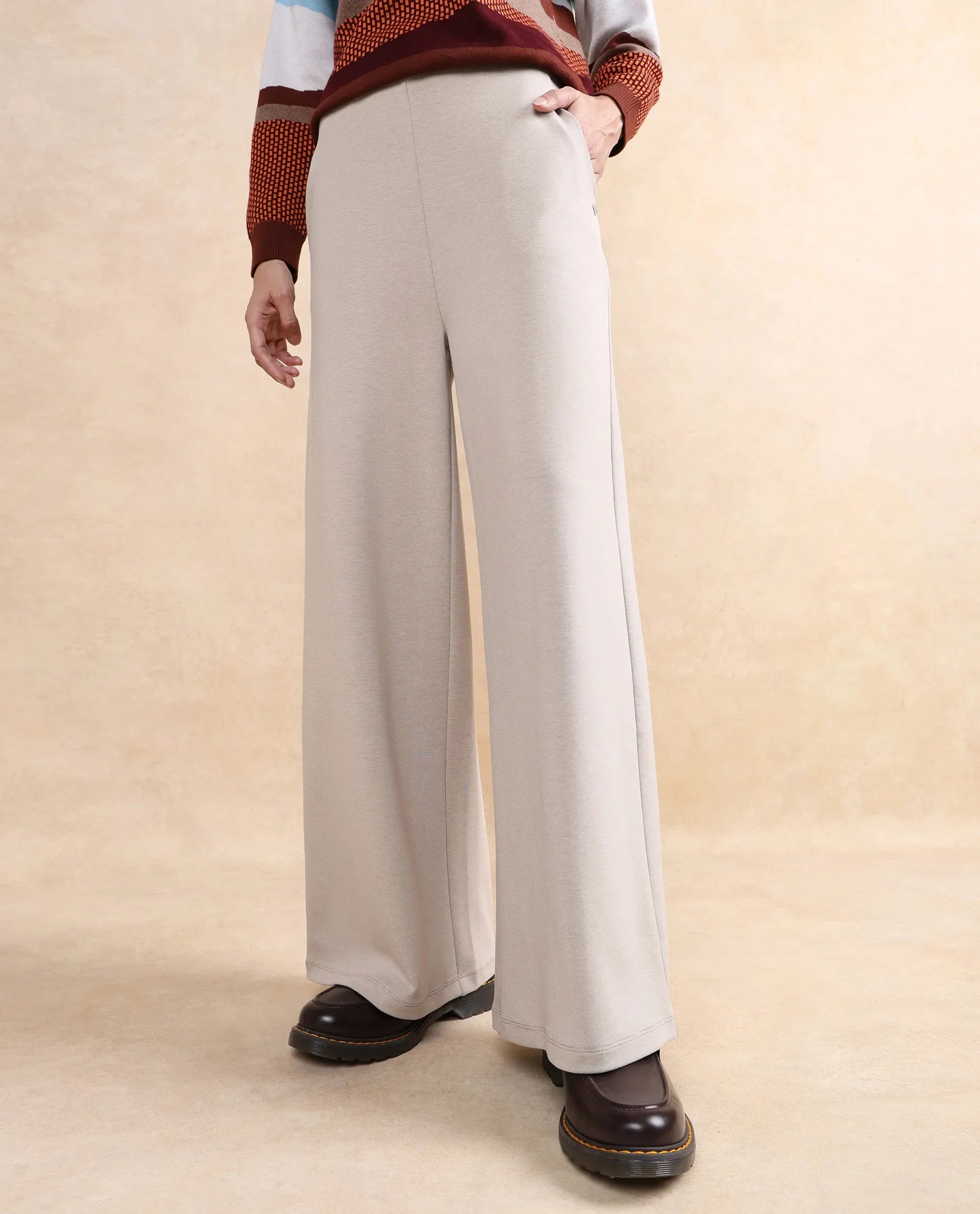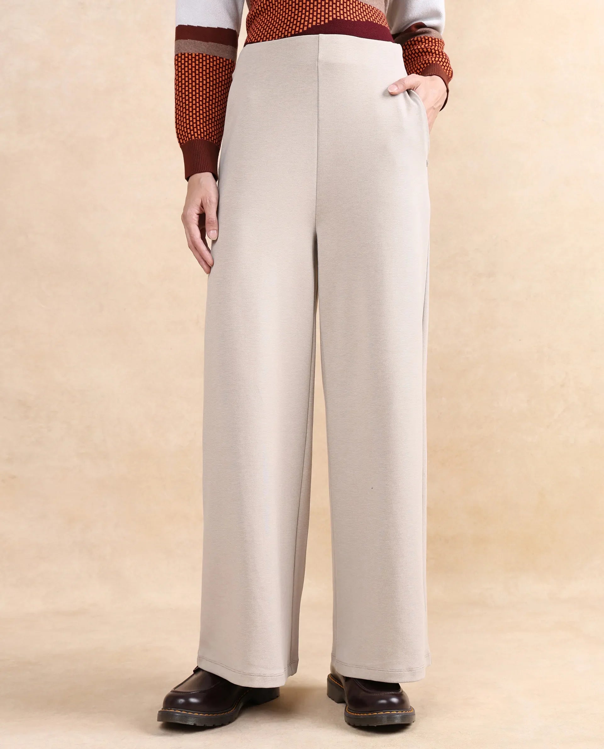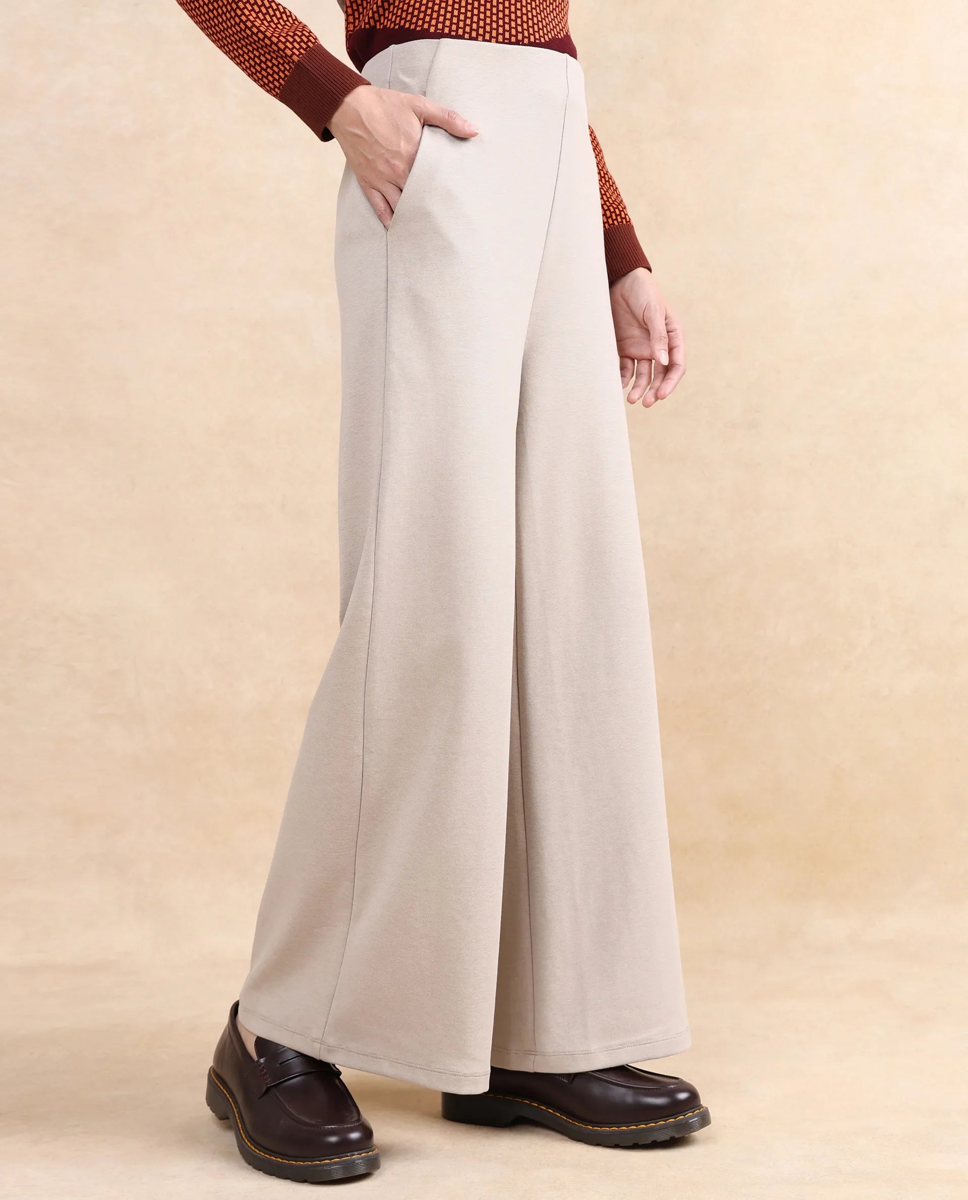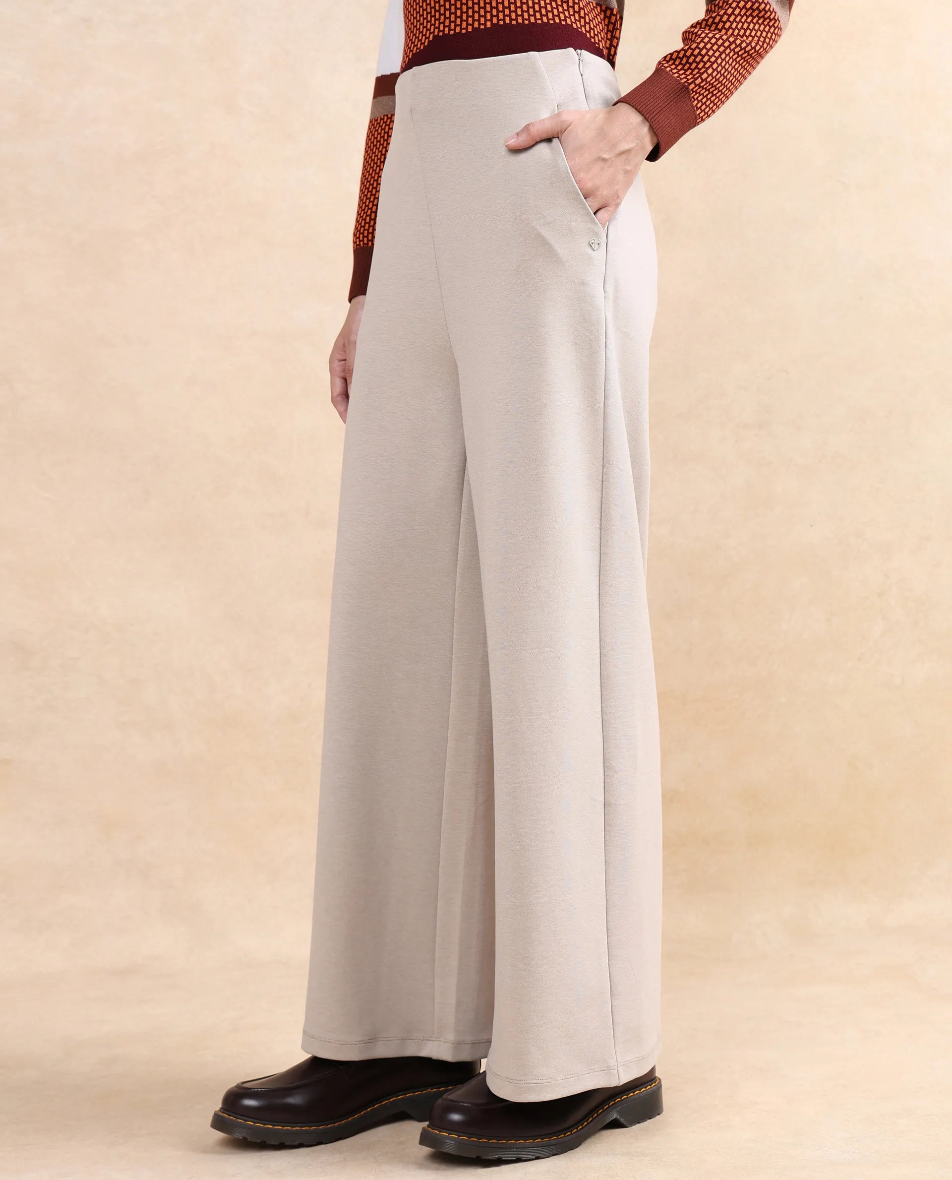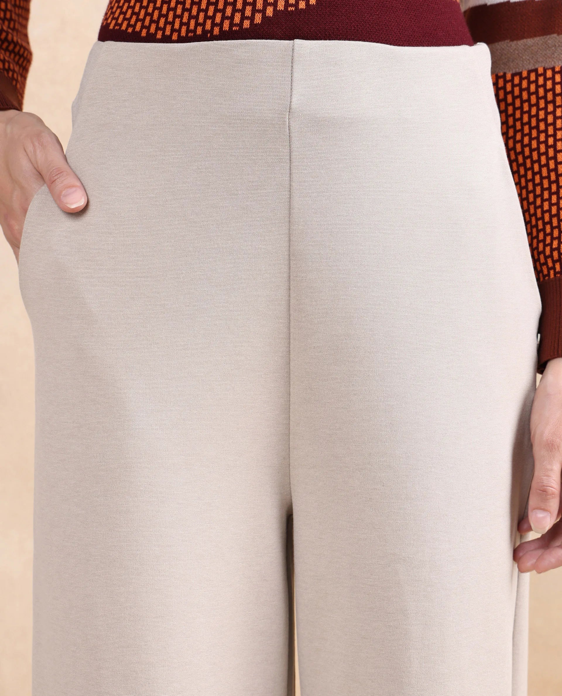 Rareism Women Shoyon Beige Cotton Viscose Fabric Wide Fit Plain Trouser