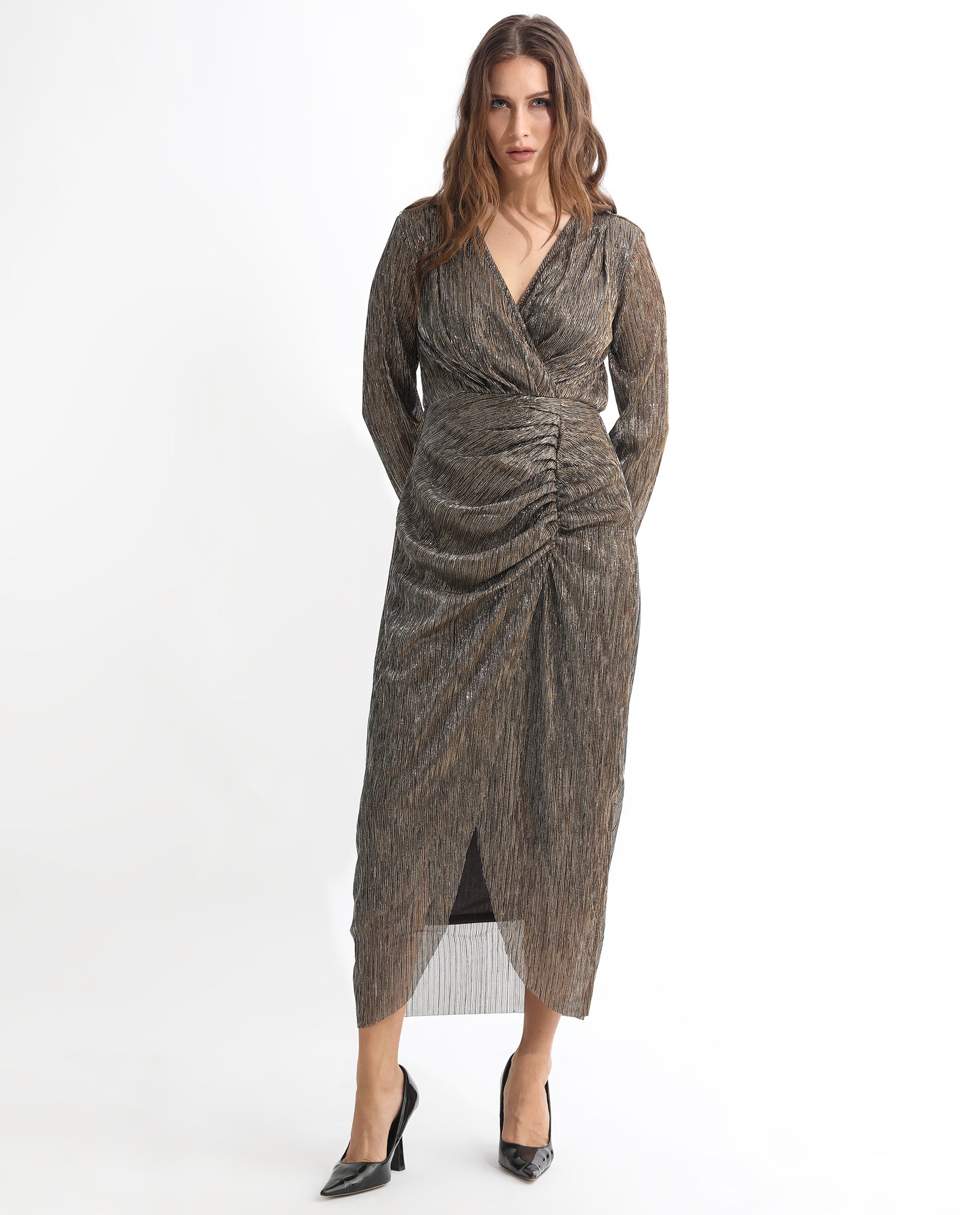 Rareism Women Siga Metallic Gold Overlap V Neck Full Sleeves Gathered Front Panel Shimmer Party Midi Dress