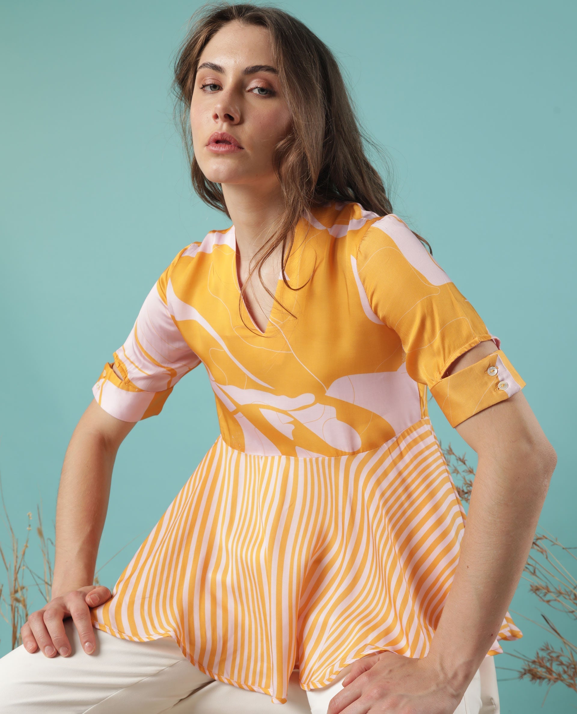 6. Crafted from modal fabric for a luxurious feel and easy care. **Description:** Elevate your wardrobe with our Satin Blend Print and Stripe Mix Top, a chic and versatile piece perfect for any occasion. This top boasts a unique mix of print and stripe designs, creating a dynamic and eye-catching look. The V-neck and empire cut with circular flare enhance the silhouette, flattering the figure and adding elegance to the design. Short sleeves with cut-away cuff add a stylish touch, while the fit and flare silhouette ensures comfort and ease of movement. With an overlapping side slit, this top offers a modern twist on a classic style. Crafted from modal fabric, it provides a luxurious feel against the skin and is easy to care for. Whether you're dressing up for a night out or keeping it casual for daytime activities, this satin blend print and stripe mix top is sure to become a favourite in your wardrobe for its versatility and stylish appeal.