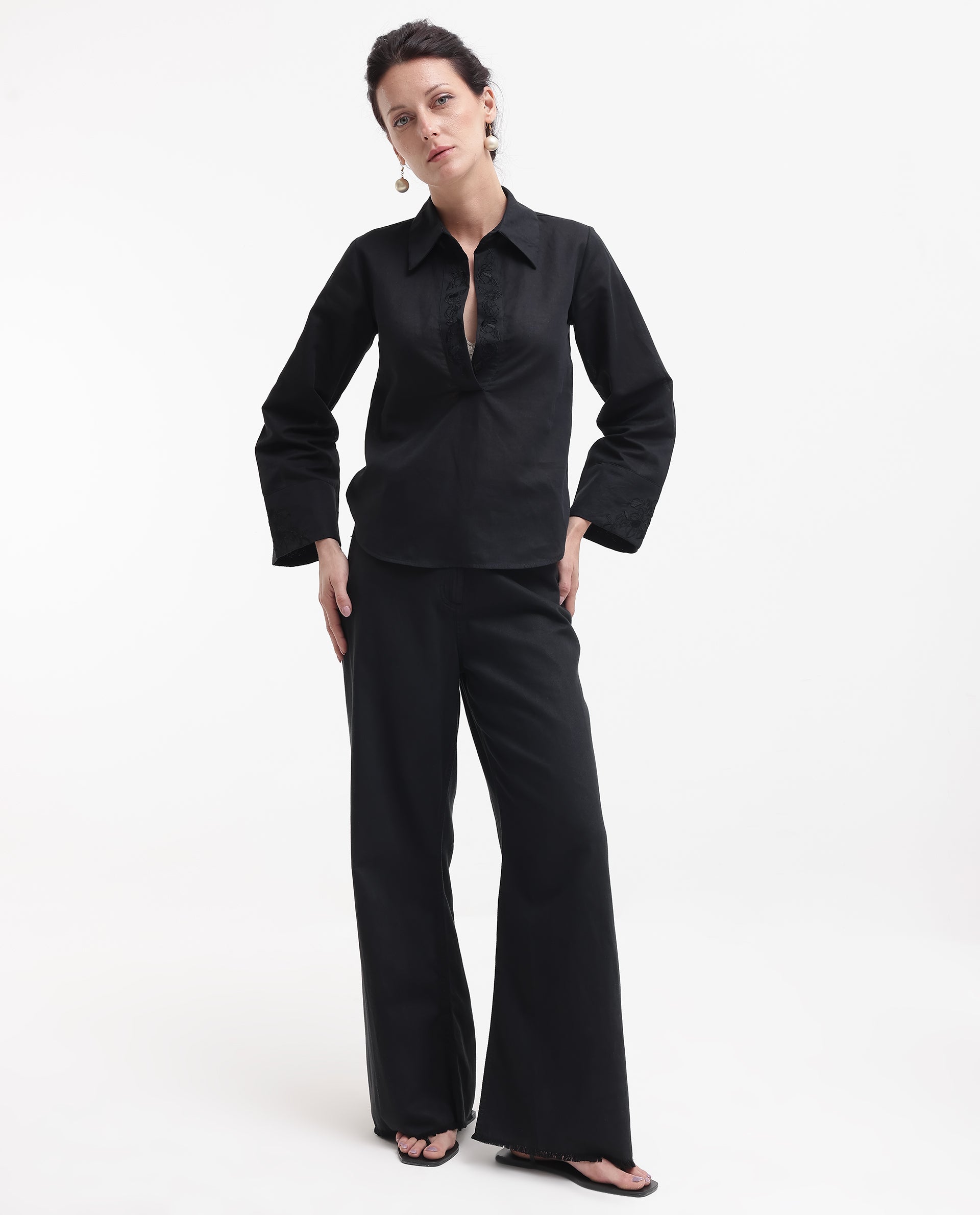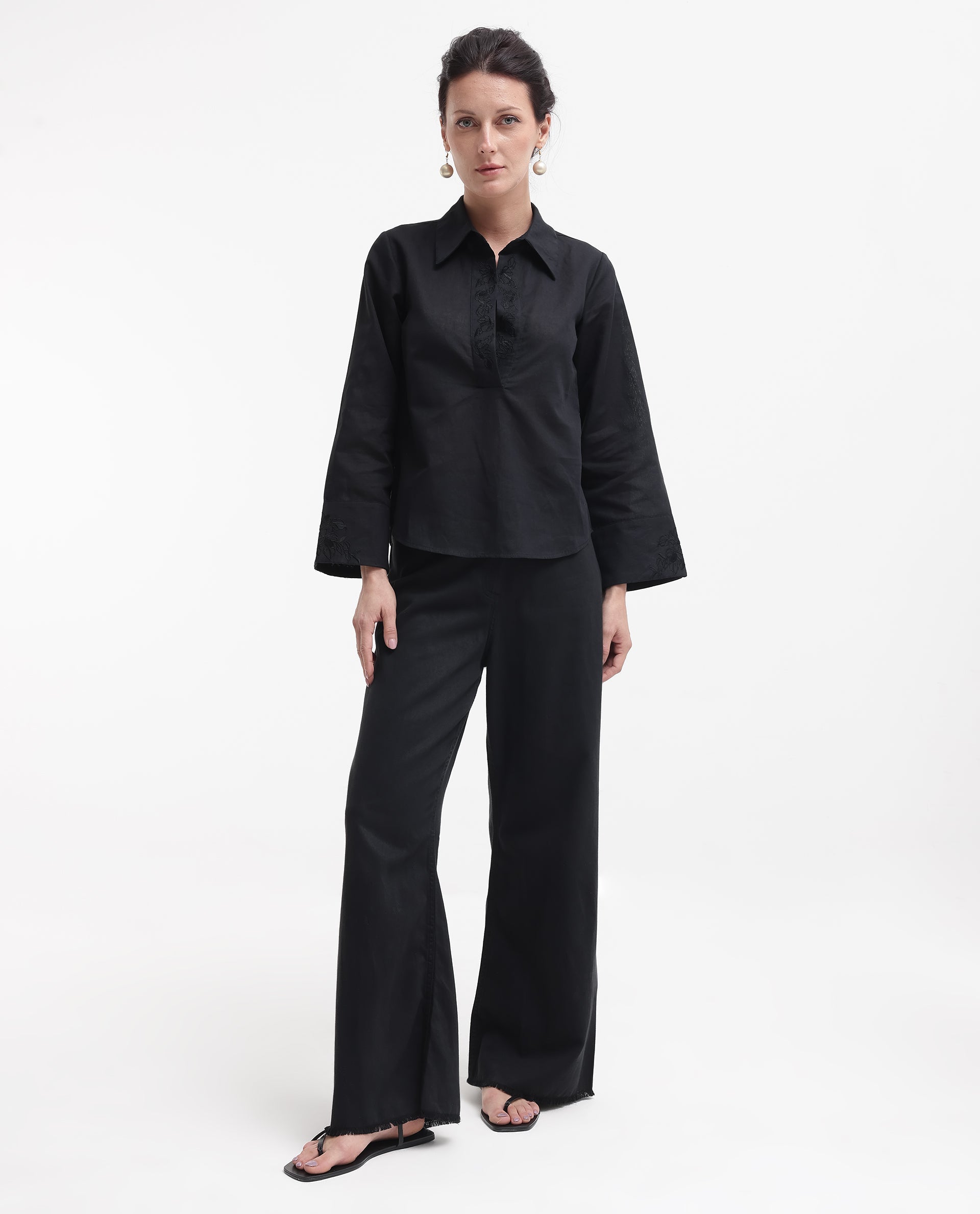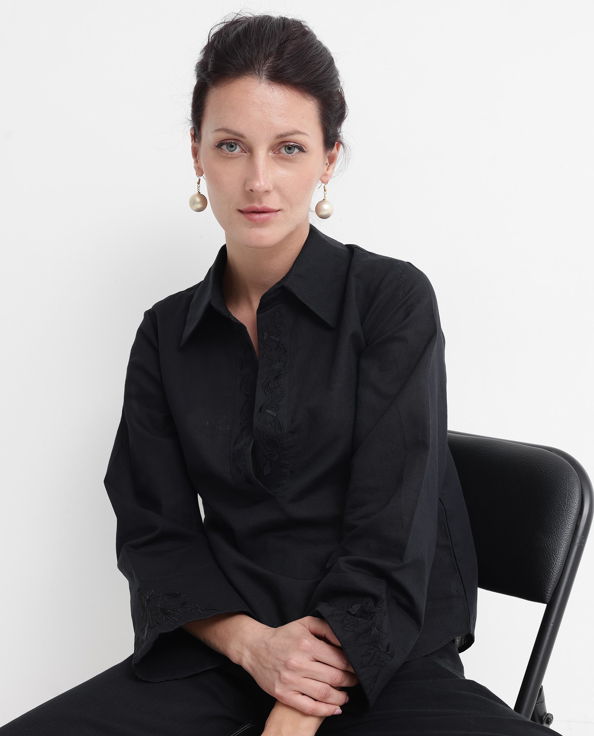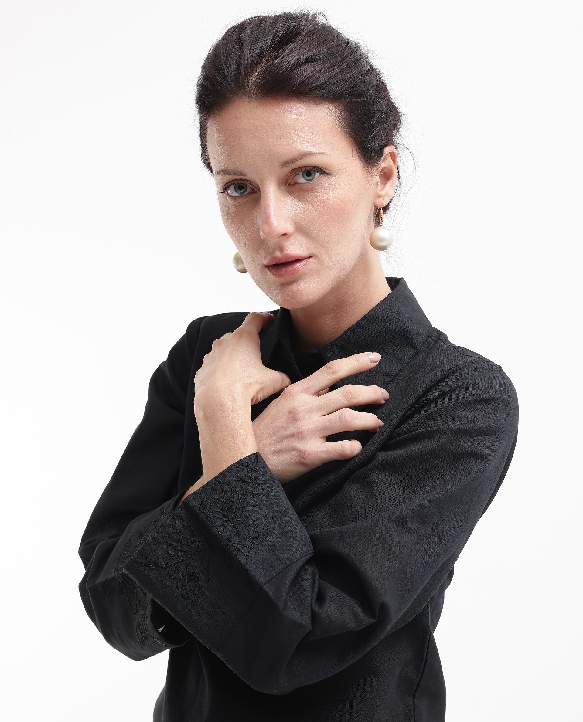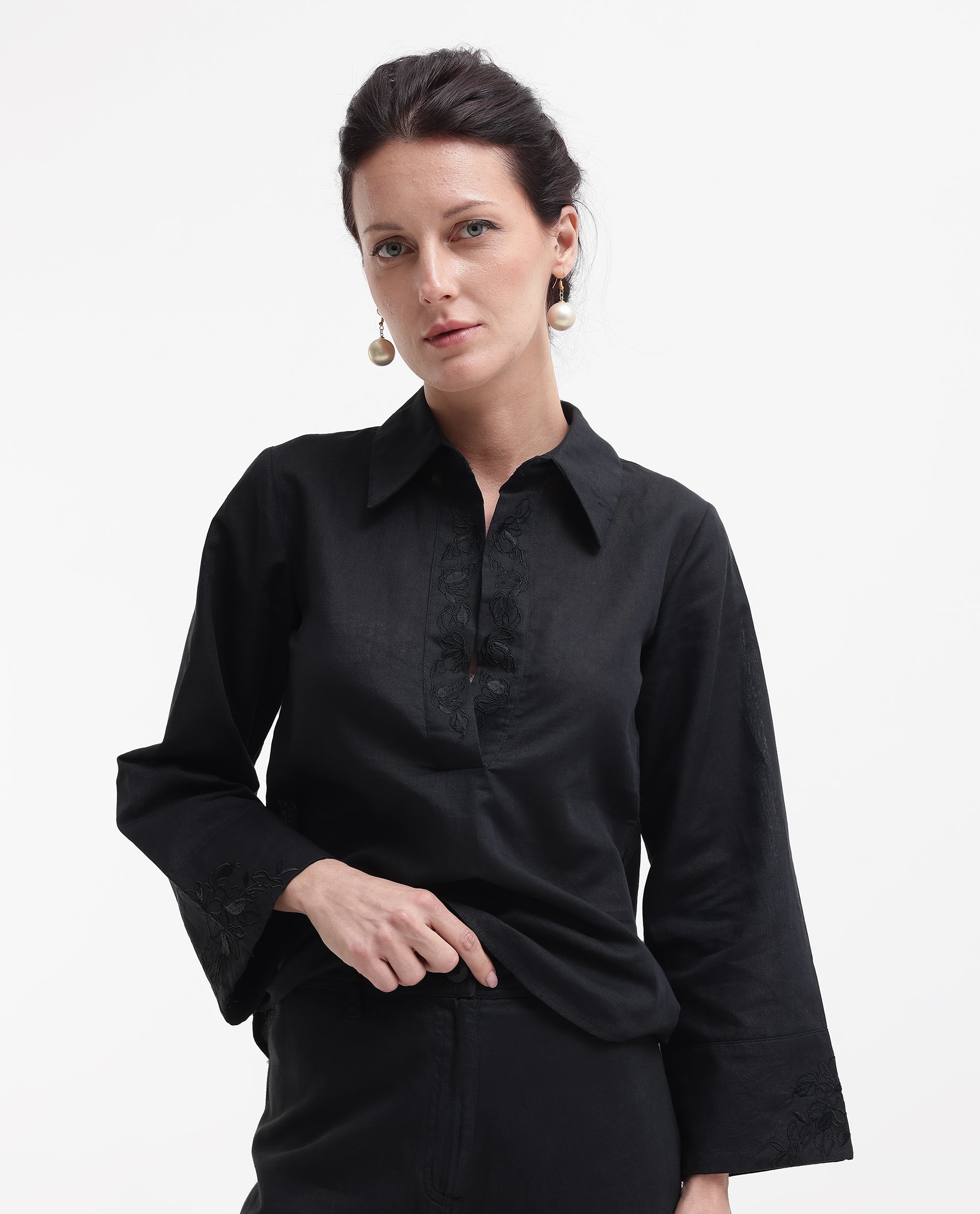 Rareism Women Sofian Black Cotton Linen Fabric Regular Sleeves Collared Neck Solid Regular Length Top