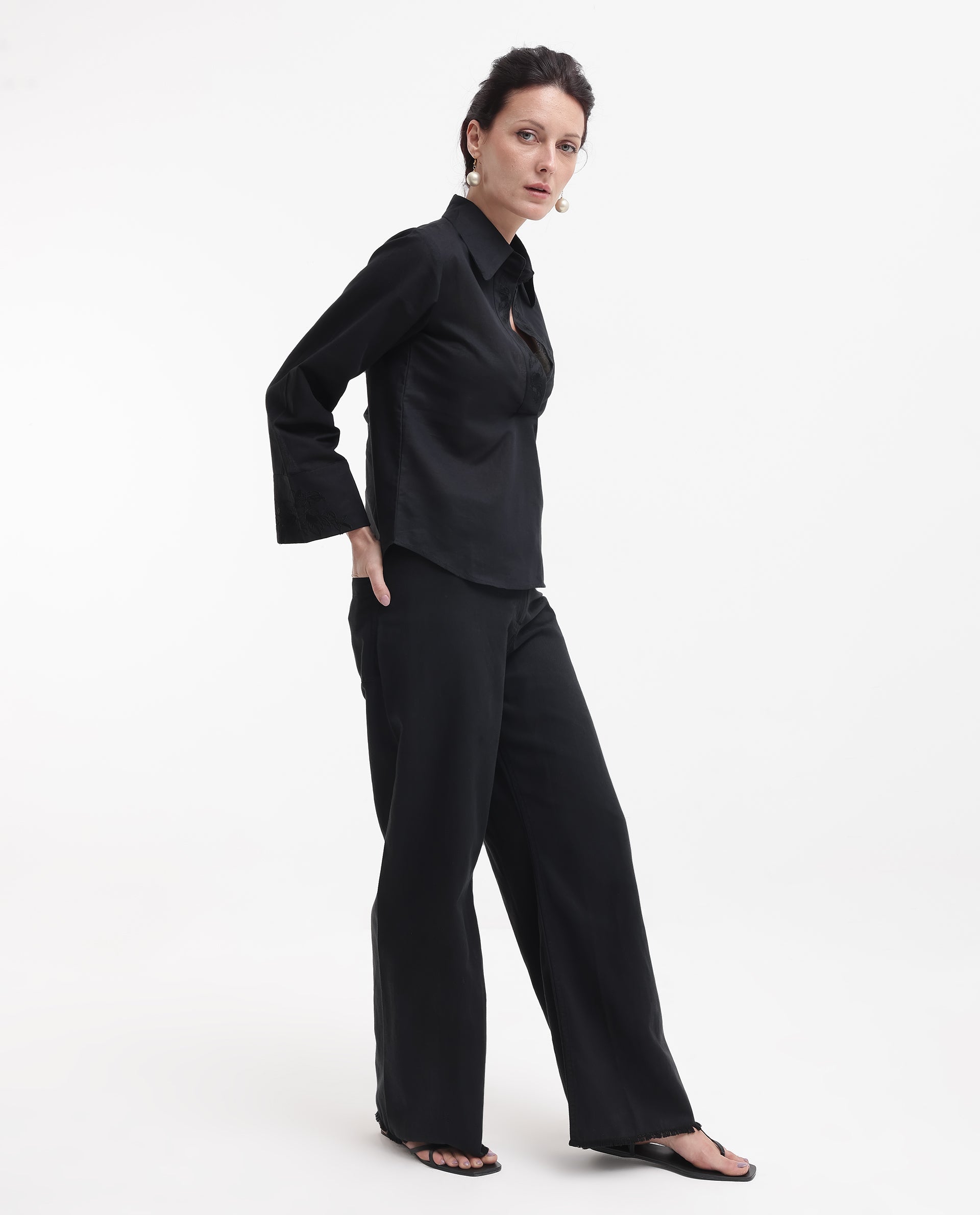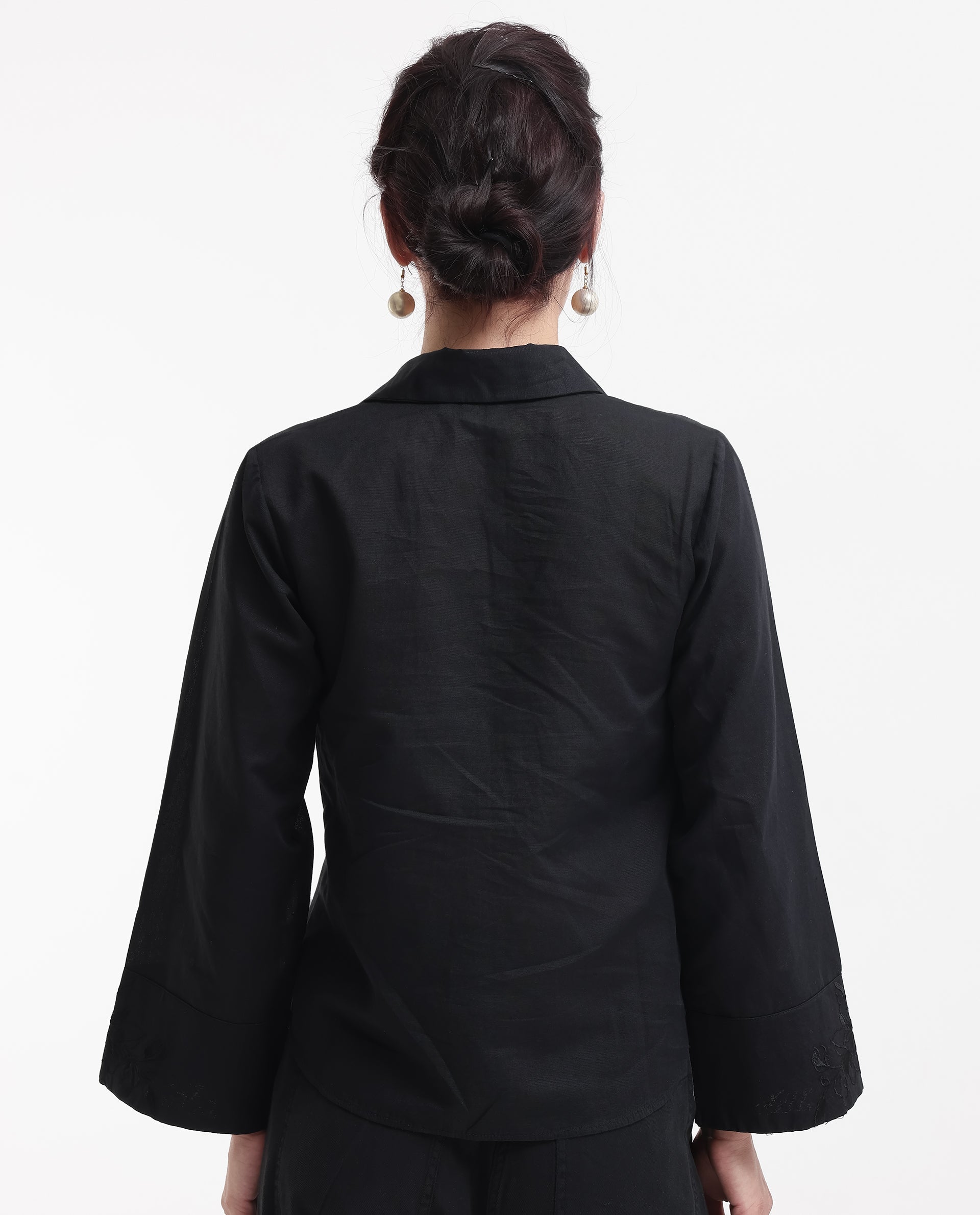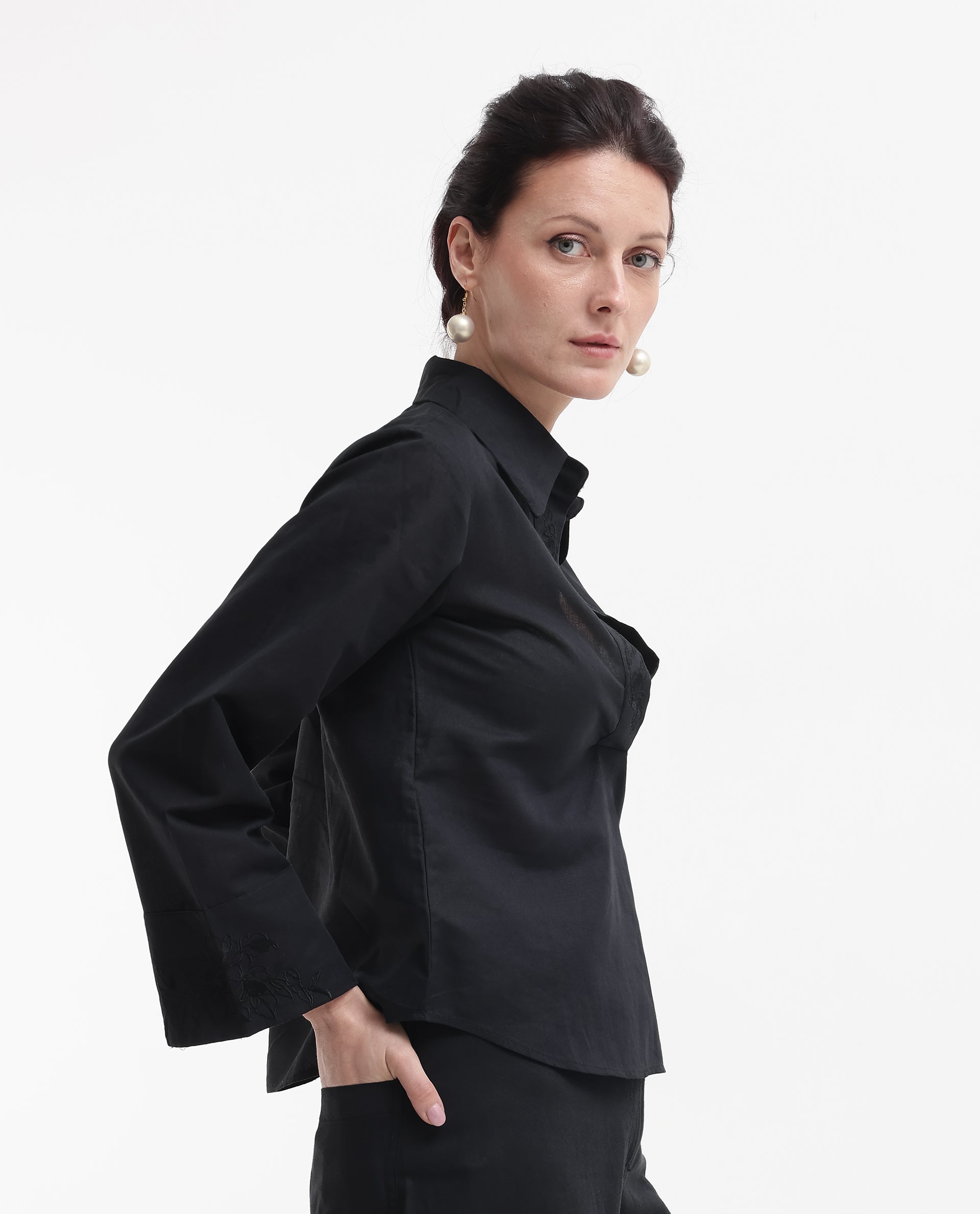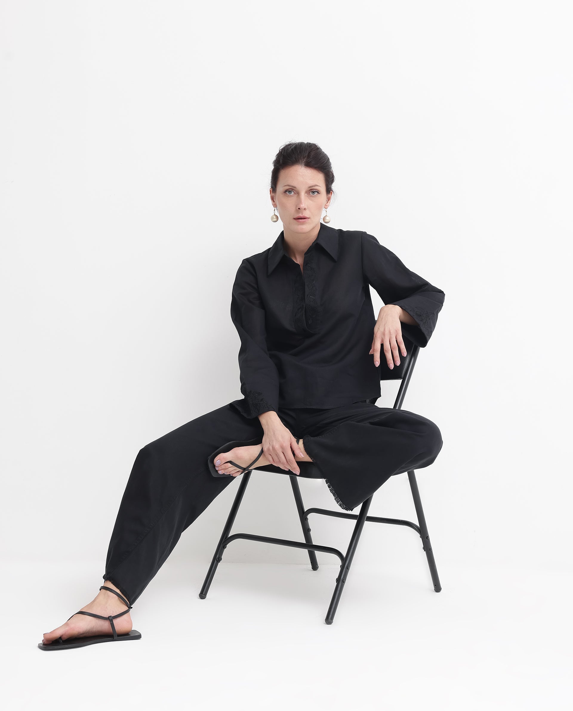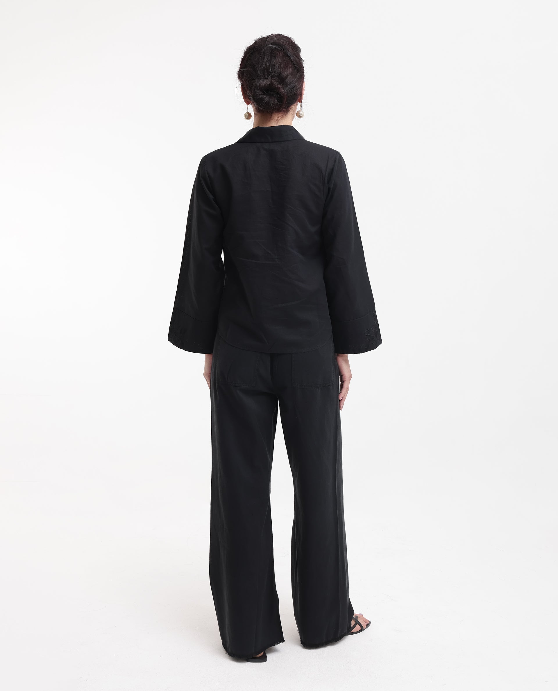 Rareism Women Sofian Black Cotton Linen Fabric Regular Sleeves Collared Neck Solid Regular Length Top