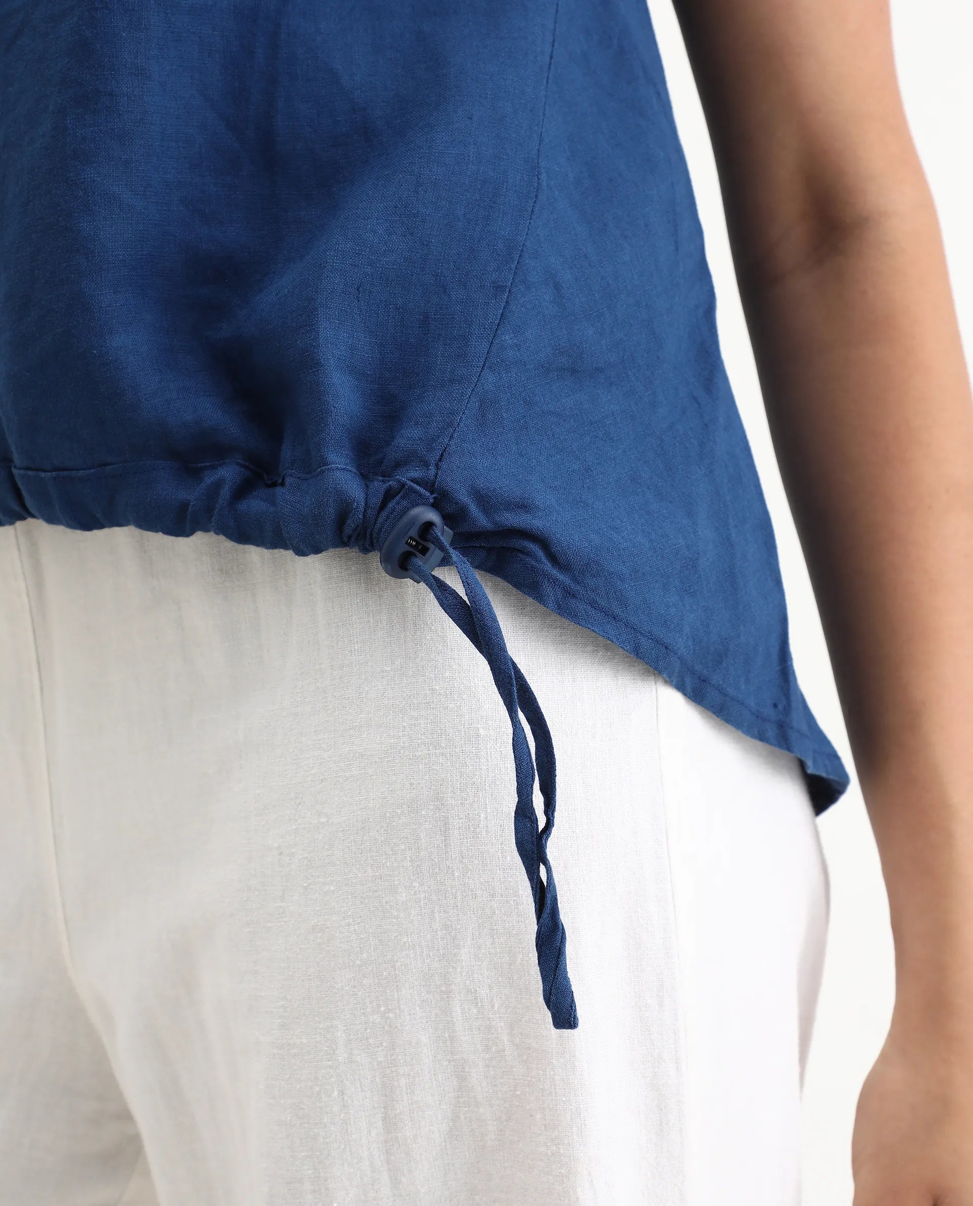 -A modern style asymmetrical linen top with side panels.