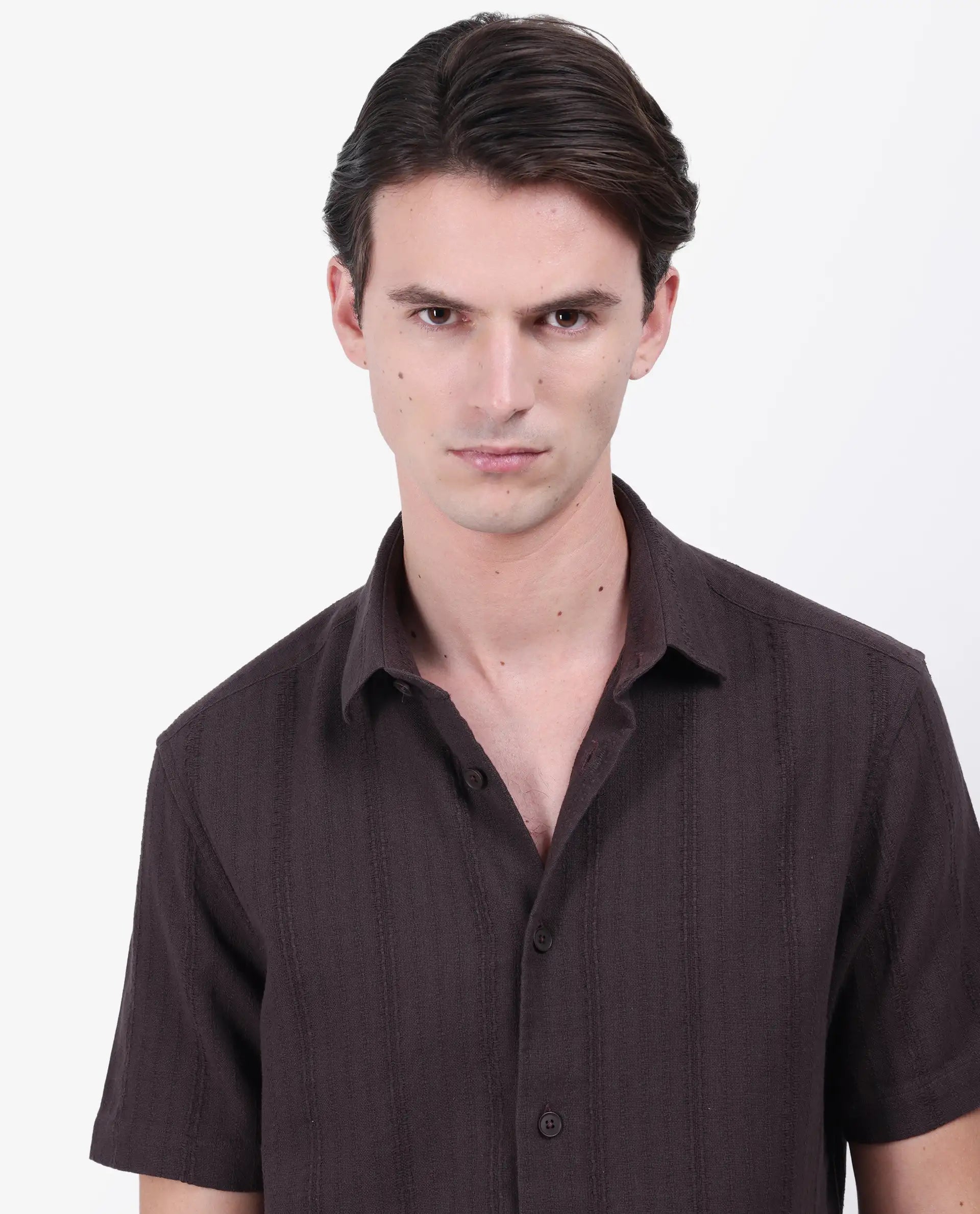 Rare Rabbit Men's Zolt Brown Cotton Fabric Short Sleeve Collared Neck Button Closure Striped Shirt